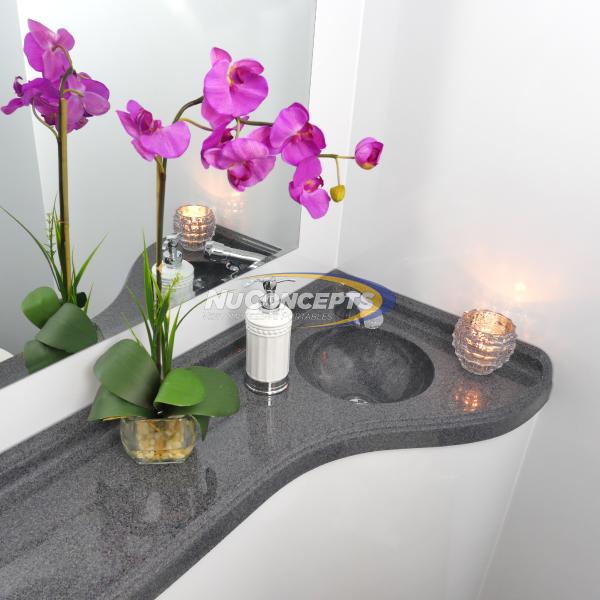 The easy to clean curved countertop with molded-in sink and upgraded faucet provides plenty of room to move and a stylish area for flowers or other decorations.