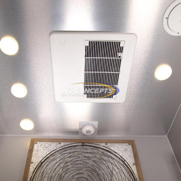 The brushed aluminum ceiling isn’t just a great look, it is the most durable and easiest to clean material. With warm toned recessed LED lights, motion activated sensor and